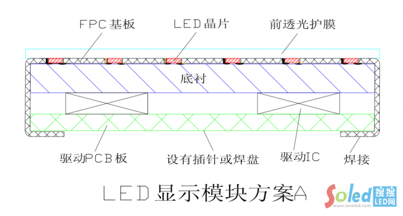 方案A:含有驅(qū)動IC的LED驅(qū)動板固定在底襯的后面,F(xiàn)PC彎折段與驅(qū)動PCB板焊連或插接。驅(qū)動PCB板設(shè)有插針或焊盤用于與外接電路連通。
