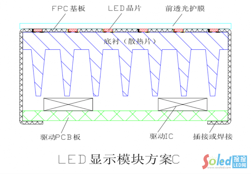 FPC基板后有底襯支撐,前有透光護膜保護,采用密封膠粘合,結(jié)構(gòu)簡單,但防水密封牢靠,無芯片磕碰脫落問題;彎曲的底襯,就得到彎曲屏面。