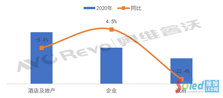 從行業(yè)來看,酒店及地產(chǎn)行業(yè)作為商用電視的支撐行業(yè),上半年需求基本處于停滯狀態(tài),商用電視銷量僅為745千臺,下半年商業(yè)地產(chǎn)加快開發(fā)進(jìn)度,彌補(bǔ)上半年損失,從而帶動商用電視銷量的增長,銷量為1251千臺, 2020年整個酒店及地產(chǎn)行業(yè)銷量同比下降5.4%。2020年上半年國內(nèi)各大品牌酒店收入銳減30%以上,在收入下降的情況下,為維持正常經(jīng)營,酒店地產(chǎn)采購主要以低端經(jīng)濟(jì)型酒店為主,而高端及以上酒店需求下降最為明顯。各企業(yè)經(jīng)營基本到第二季度開始全面復(fù)工,第四季度才恢復(fù)疫前水平,在企業(yè)行業(yè)中商用電視全年銷量同比增長4.5%,相比于另兩大行業(yè),企業(yè)復(fù)蘇相對穩(wěn)健,銷量上升主要源于制造業(yè)和電信郵政行業(yè)。而2020年政府非緊急非剛性需求壓縮,整個政府行業(yè)需求為993千臺,同比下降22.4%,成為商用電視市場規(guī)模下降的主要源頭之一,其中以公共服務(wù)支出減少最為明顯,教育和交通采購需求有所上升。