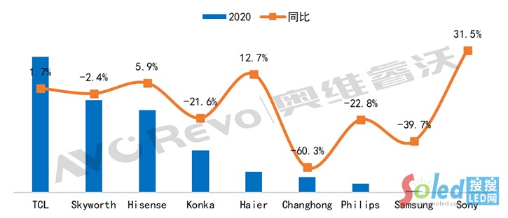 從區(qū)域來看,華東區(qū)域作為國家經(jīng)濟(jì)發(fā)展要地,抗風(fēng)險能力最強(qiáng),經(jīng)濟(jì)復(fù)蘇最快,2020年占據(jù)整個商用電視市場31.1%的銷量份額,市場銷量同比增長13.2%。華西地區(qū)受國家醫(yī)療和教育支出增加的影響,同比增長最快(22%)。華北和東北地區(qū)銷量同比下降35.6%,主要受國家非剛性需求減少的影響。而華南地區(qū)受旅游業(yè)影響,經(jīng)濟(jì)復(fù)蘇緩慢,銷量同比下降14.4%。