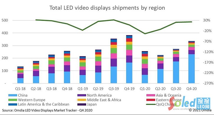 根據(jù)Omdia《LED顯示屏市場追蹤》報告顯示,盡管2020年第四季度的全球?qū)嶋H出貨情況比預(yù)期高出0.2%,但除中國以外的其他市場仍面臨不同程度的同比下降。