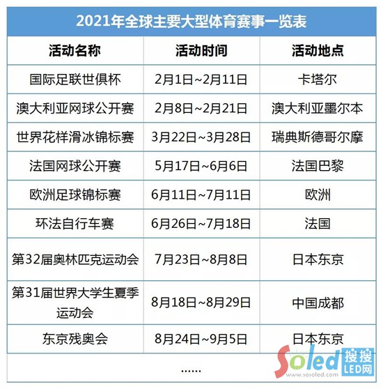 除東京奧運(yùn)會(huì)之外,今年夏季舉辦的歐洲杯也可能受到疫情的影響。歐洲杯或許會(huì)采取與歐冠類似的方式將球隊(duì)集中到幾個(gè)地區(qū),進(jìn)行封閉式比賽。這些活動(dòng)的取消或現(xiàn)場(chǎng)觀眾的減少,都將造成LED顯示應(yīng)用企業(yè)相關(guān)訂單的損失。