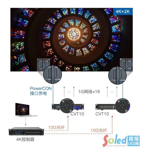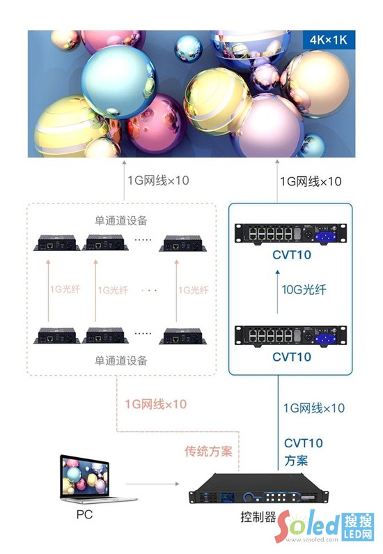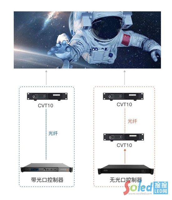 1路光纖可控多網(wǎng)口,1臺CVT10頂多臺單通道光電轉(zhuǎn)換器,最大可帶載4K×1K大屏,大幅精簡設(shè)備、安裝更便捷。