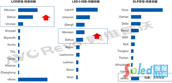 LCD拼接:2020年銷量TOP3為?、大華和宇視,均為安防頭部品牌,占到市場50%的份額,且同比提高5.2個百分點(diǎn)。從規(guī)模來看,?岛痛笕A的平板拼接年銷售量均達(dá)到15萬臺以上,明顯處在高位,宇視年銷售量近6萬臺,增幅超過40%,增勢強(qiáng)勁。