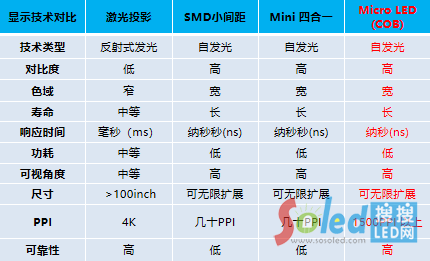 COB(chip on board)微顯示技術(shù)集70%的封裝技術(shù)與30%的顯示技術(shù)于一身。雷曼光電以及三星、索尼等國(guó)際顯示巨頭在100吋以上大尺寸顯示時(shí)均選擇了COB技術(shù)路線。它與LCD、OLED、激光投影、SMD小間距、Mini四合一相比,不僅保持了優(yōu)異的顯示性能,而且在防腐蝕能力、抗沖擊能力、長(zhǎng)期穩(wěn)定工作能力方面具有特殊優(yōu)勢(shì)。