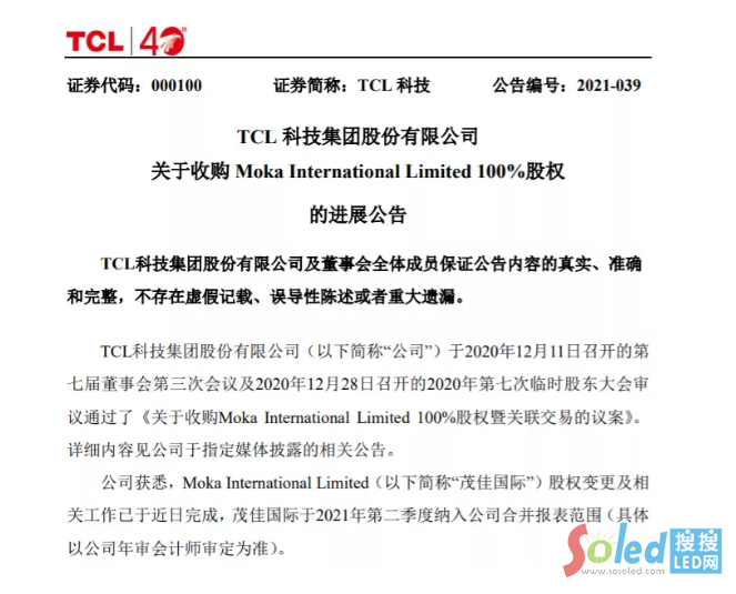 4月23日晚間,TCL科技發(fā)布公告稱,公司28億元收購Moka International Limited(茂佳國際)100%股權,股權變更及相關工作已于近日完成,茂佳國際于2021年第二季度納入公司合并報表范圍。