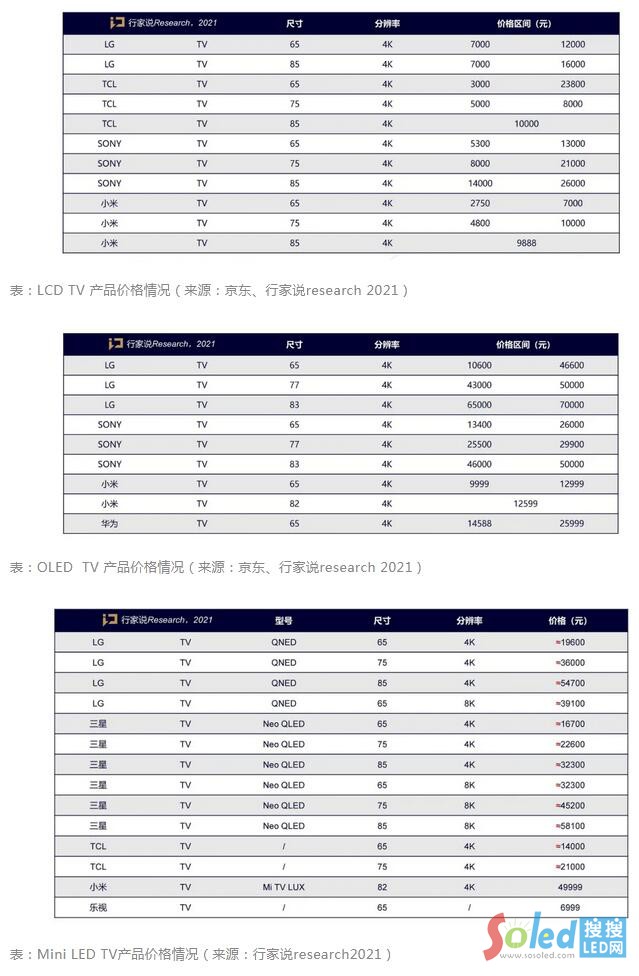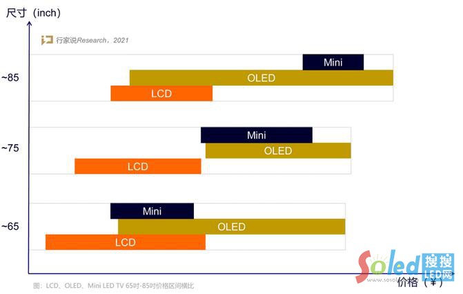 通過(guò)上圖的直觀對(duì)比,可以看到,LCD產(chǎn)品除了少量?jī)r(jià)格定位與高端產(chǎn)品,主要是定位于普通產(chǎn)品。65吋產(chǎn)品,Mini LED背光和LCD高端產(chǎn)品以及部分OLED產(chǎn)品有所重疊。而75吋產(chǎn)品,Mini LED背光與OLED的價(jià)格有很高的重疊度,均是定位于價(jià)格較高的高端市場(chǎng)。此外,除了85吋的Mini LED背光價(jià)格較高之外,目前電視產(chǎn)品的主流出貨尺寸65吋和75吋,目前已推出的Mini LED背光產(chǎn)品相比同尺寸的OLED,價(jià)位略低。
