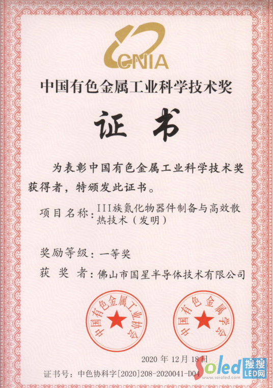 核心提示:近期,中國有色金屬工業(yè)協(xié)會、中國有色金屬學會聯(lián)合發(fā)布了《關于頒發(fā)2020年度中國有色金屬工業(yè)科學技術獎的通知》,國星光電全資子公司國星半導體憑借“Ⅲ族氮化物器件制備與高效散熱技術(發(fā)明)” 榮獲中國有色金屬科學技術獎一等獎。