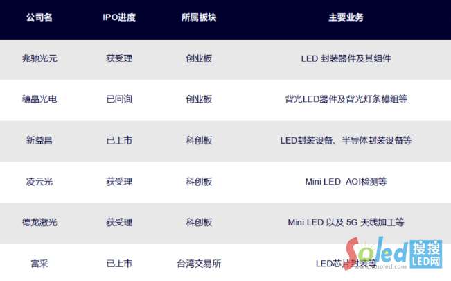 2021年被稱為是Mini LED商用元年,今年已過半,不少Mini LED相關(guān)企業(yè)已上市或在上市的路上。據(jù)不完全統(tǒng)計,今年上半年,已有6家企業(yè)獲上市新進度,其中包含封裝廠商兆馳光元、穗晶光電;設(shè)備商新益昌、凌云光、德龍激光,以及晶電與隆達合組的富采控股。
