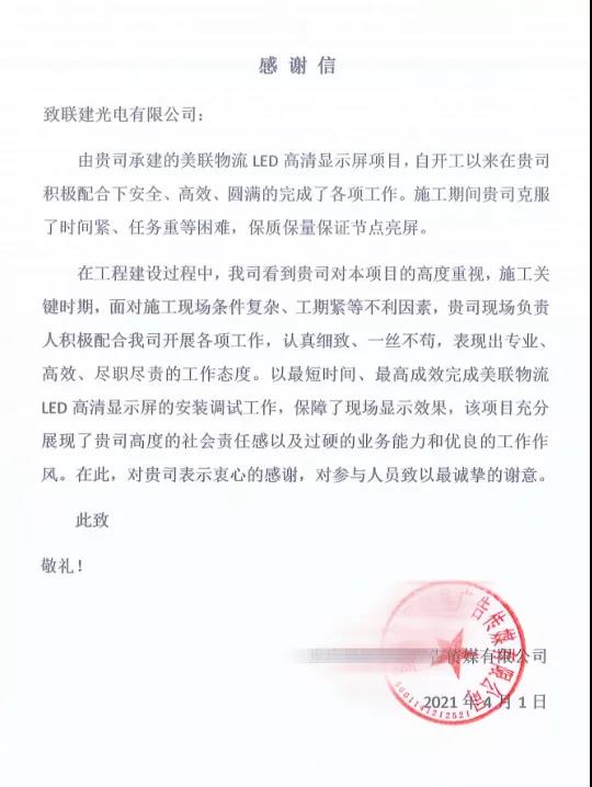 *聯(lián)建光電美聯(lián)廣場、玉章故居項(xiàng)目感謝信