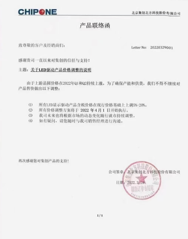 此外,市場上也有一種聲音認(rèn)為去年驅(qū)動IC漲價潮有囤積居奇、投機(jī)炒作芯片的行為推波助瀾,2021年,由于漲聲不停,特別是IC端漲價與缺貨帶來的影響,許多LED工程屏項目被迫延后,相關(guān)廠商苦不堪言。2021年年底以來“缺芯”問題已有所緩解,但受疫情反復(fù)影響,2022年以來,半導(dǎo)體供給持續(xù)緊張,集創(chuàng)北方率先發(fā)布漲價函,難免讓LED顯示屏企業(yè)緊繃神經(jīng),對于此輪漲價會不會傳導(dǎo)到下游,其他驅(qū)動廠商是否會跟進(jìn),終端屏企是否引起聯(lián)動,后續(xù)影響幾何,仍需進(jìn)一步觀察。