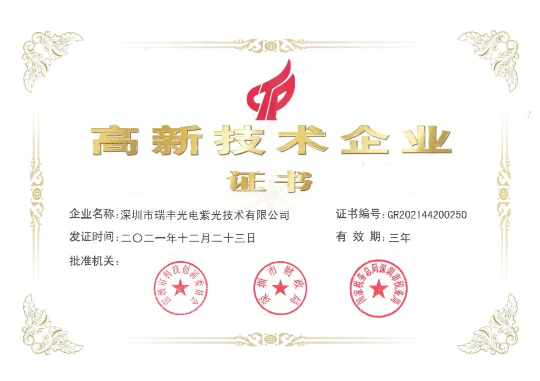 瑞豐光電全資子公司瑞豐紫光技術(shù)通過(guò)國(guó)家高新技術(shù)企業(yè)認(rèn)定