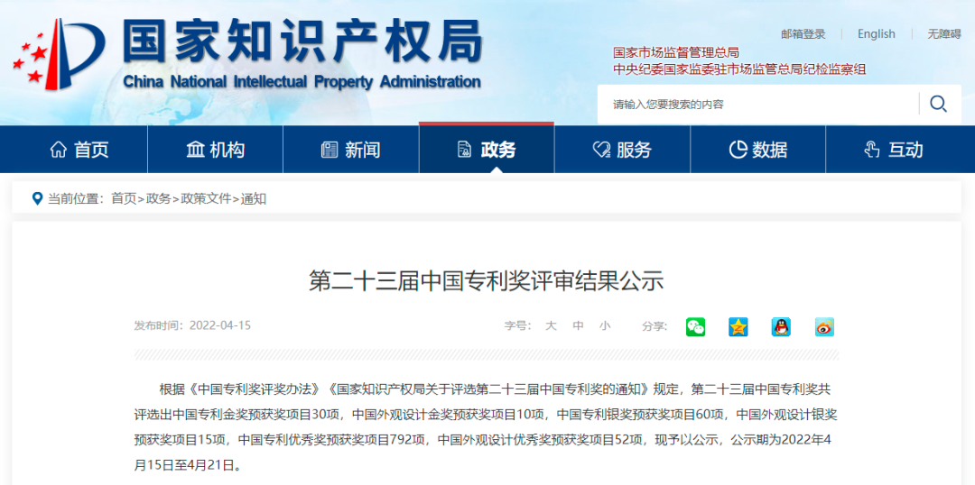 中國(guó)專利獎(jiǎng)是我國(guó)唯一的專門對(duì)授予專利權(quán)的發(fā)明創(chuàng)造給予獎(jiǎng)勵(lì)的政府部門獎(jiǎng),也是我國(guó)知識(shí)產(chǎn)權(quán)領(lǐng)域的最高級(jí)別榮譽(yù),得到聯(lián)合國(guó)世界知識(shí)產(chǎn)權(quán)組織的認(rèn)可,極具公信力、代表力與影響力。
