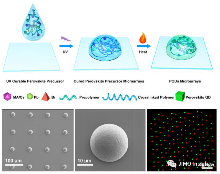 MicroLED是實現(xiàn)虛擬/增強(qiáng)現(xiàn)實(VR/AR)顯示的重要技術(shù),而全彩化是其發(fā)展所面臨的關(guān)鍵挑戰(zhàn)。量子點色轉(zhuǎn)換技術(shù)(QDCC)將紅、綠量子點色轉(zhuǎn)換膜置于藍(lán)光microled上取代紅、綠LED,被認(rèn)為是解決MicroLED顯示所面臨的紅光LED缺失、巨量轉(zhuǎn)移等難題的候選技術(shù)路線之一。與傳統(tǒng)CdSe和InP量子點相比,鈣鈦礦量子點具有高的吸收系數(shù)、可原位制備等特點,成為量子點色轉(zhuǎn)換應(yīng)用的重要材料體系之一。北京理工大學(xué)智能光子學(xué)課題組是國際上最早開展鈣鈦礦量子點的課題組之一。2015年,張峰、吳顯剛等人發(fā)明了鈣鈦礦量子點再沉淀制備技術(shù),首次展示了鈣鈦礦量子點的寬色域LED器件(ACS Nano 2015, 9, 4533);2016年,周青超等人發(fā)明了鈣鈦礦量子點原位制備技術(shù)(Advanced Materials 2016, 28, 9163),經(jīng)過產(chǎn)學(xué)研合作,在全球率先推出了搭載鈣鈦礦量子點光學(xué)膜的電視樣機(jī)和首批商業(yè)化電視。近日,該團(tuán)隊的楊高嶺特別副研究員與光電學(xué)院趙躍進(jìn)教授合作,將微透鏡結(jié)構(gòu)引入Micro LED發(fā)光像素中,構(gòu)筑出了具有三維結(jié)構(gòu)的新型鈣鈦礦量子點微陣列,相關(guān)研究成果以“Perovskite Quantum Dot Microarrays: In Situ Fabrication via Direct Print Photopolymerization”為題,在國際知名期刊Nano Research上發(fā)表(DOI:10.1007/s12274-022-4466-4)。立足Micro LED量子點色轉(zhuǎn)換技術(shù),本工作提出了將噴墨打印與光聚合結(jié)合的策略,發(fā)明了直接打印光聚合原位制備技術(shù),原位制備出具有微透鏡光學(xué)結(jié)構(gòu)的鈣鈦礦量子點圖案,實現(xiàn)了像素尺寸20微米、高度接近10微米的半球形三維鈣鈦礦量子點彩色微陣列,為解決打印像素中發(fā)光不均勻、藍(lán)光泄露等問題提供了新的思路,為Micro LED色轉(zhuǎn)換、CCD紫外增強(qiáng)探測等光轉(zhuǎn)換應(yīng)用提供了新的技術(shù)路線。