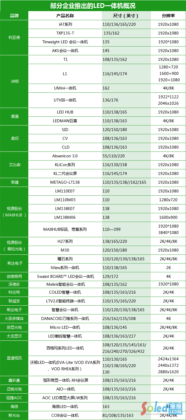 正是看到了LED一體機廣闊的市場需求,包括視源股份、利亞德、洲明、艾比森、奧拓電子、雷曼、聯(lián)建、京東方、?怠⒑P、TCL等企業(yè)都有涉足本領(lǐng)域。上半年,視源股份教育業(yè)務(wù)(希沃)實現(xiàn)營業(yè)收入16.97億萬元。利亞德會議一體機形成收入1.62億元,較上年同期增長迅速。艾比森上半年會務(wù)業(yè)務(wù)實現(xiàn)營業(yè)收入約0.45億元,簽單約0.53億元,簽單已恢復(fù)到2019年同期疫情前約115%。奧拓電子新簽合同金額約5,100萬元,累計為國內(nèi)外50多個政企及高校客戶提供了解決方案及產(chǎn)品,包括深圳市羅湖區(qū)“數(shù)字政府”項目、香港理工大學(xué)、中國地質(zhì)大學(xué)等政企及高校項目。由于LED一體機市場格局還未真正形成,未來各個品牌都有搶奪龍頭的機會。