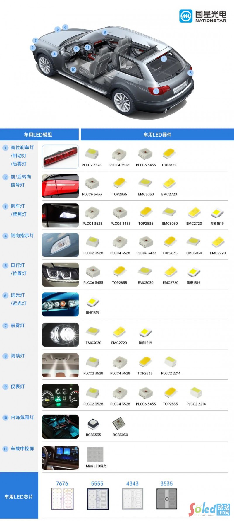國星光電已形成完善的汽車外飾LED產(chǎn)品線,該系列包括前照燈、遠近光燈、日行燈、示寬燈、側(cè)向指示燈、前后霧燈、前后轉(zhuǎn)向信號燈、前后位置燈、制動燈、倒車燈、牌照燈等