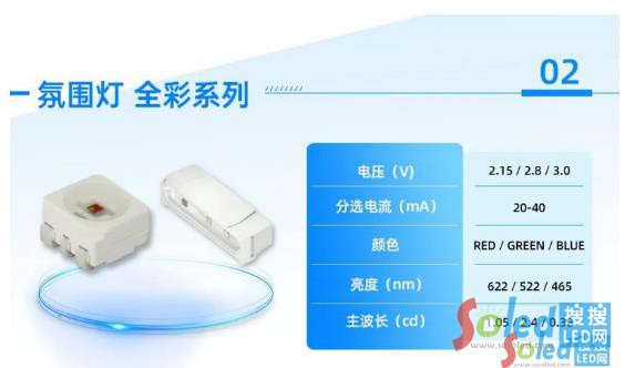 汽車氛圍燈作為智能座艙的核心要素,是汽車產(chǎn)業(yè)創(chuàng)新的主要場景。白光器件事業(yè)部聚焦市場需求,全新推出智能氛圍LED系列產(chǎn)品,其包括腳步空間氛圍燈、中控臺氛圍燈、頭部空間氛圍燈、車門氛圍燈、車外迎賓燈等,可根據(jù)溫度、車速、音樂、喜好、環(huán)境來調(diào)節(jié)光源的波長、顏色、亮度等,產(chǎn)品色彩多樣出光均勻,可顯著增強人車交互體驗,提高行車安全系數(shù),讓用戶在高品質(zhì)的光色中享受智能駕駛的快感。