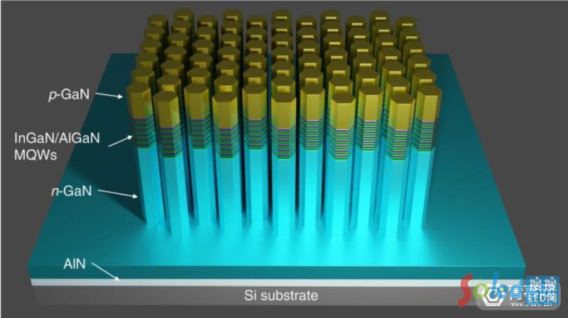 目前已經(jīng)可以制造出高效、大面積的藍(lán)色和紅色LED,但制造出高效、大面積的綠色LED非常困難,將LED組件尺寸縮減到1微米也具有挑戰(zhàn)性。而為了解決這一問題,密歇根大學(xué)教授Zetian Mi和他的團(tuán)隊(duì)開發(fā)了一種亞微米級的III-氮化物綠色MicroLED,其特點(diǎn)是使用了直徑僅100到200納米,間距僅幾納米的納米線陣列。
