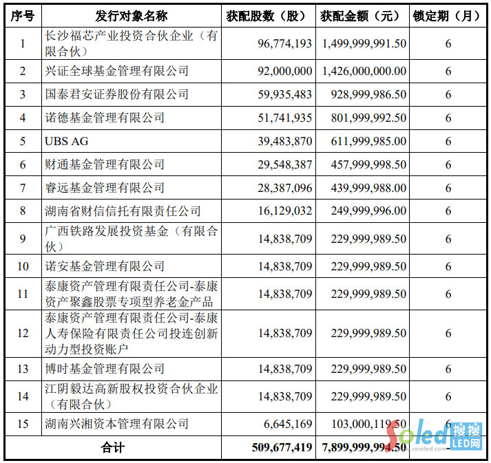 2021年9月底,三安光電宣布擬非公開發(fā)行股票募資79億元,資金用途是建設(shè)湖北三安Mini/Micro顯示產(chǎn)業(yè)化項(xiàng)目及補(bǔ)充流動(dòng)資金。該定增項(xiàng)目于今年3月獲得證監(jiān)會(huì)審核通過,于近日正式落地,募集資金凈額為 7,869,589,200.99 元,長沙福芯、興證全球基金、國泰君安等15家投資者參投。