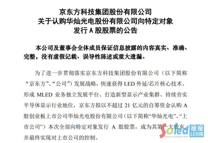 11月6日,京東方發(fā)布公告稱,擬以不超過21億元的自籌資金認(rèn)購華燦光電向特定對象發(fā)行的A股股票,認(rèn)購?fù)瓿珊髮⒁?3.08%持股比例成為該公司第一大股東。