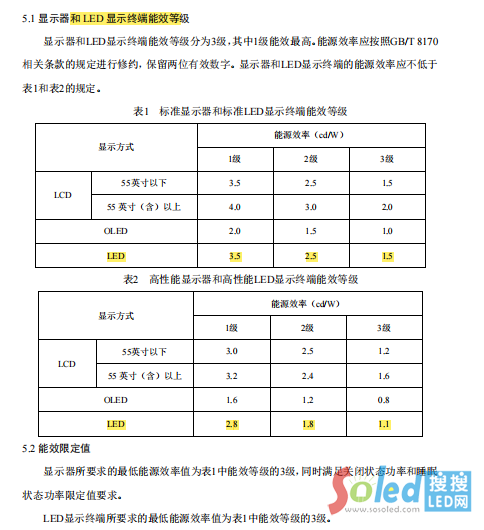 《顯示器能效限定值及能效等級》(202052552-Q-469)標(biāo)準(zhǔn)是首次將LED顯示納入標(biāo)準(zhǔn)范圍內(nèi)。根據(jù)當(dāng)前《顯示器能效限定值及能效等級》征求意見稿(2022.9.19 PDF),LED顯示終端能效等級分為三級,其中1級能效最高,能源效率不低于下面表1和表2的要求。