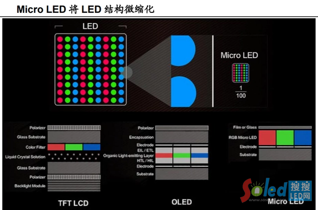 據(jù)悉,Micro LED是將傳統(tǒng)LED結(jié)構(gòu)進行矩陣化、微縮化,尺寸縮小至1~10μm,通過巨量轉(zhuǎn)移將固晶轉(zhuǎn)移到基板上后,再利用物理沉積完成保護層和電極,最后封裝而成的。