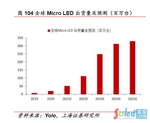 研發(fā)力度加大將推動Micro LED成本降低,目前,LED顯示屏價格平均每年下滑20%-30%。根據(jù)Yole數(shù)據(jù)顯示,2020年全球Micro LED產(chǎn)品出貨量為1890萬臺,預(yù)計2025年將達到3.3億臺。