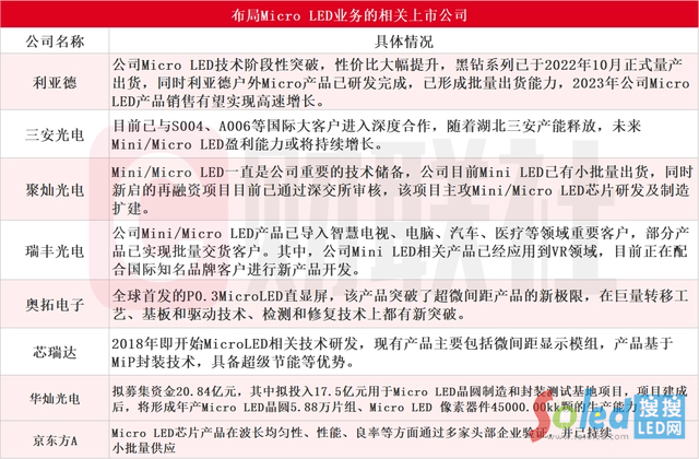 據(jù)財聯(lián)社不完全統(tǒng)計,涉及Micro LED業(yè)務(wù)的相關(guān)上市公司包括利亞德(300296)、三安光電(600703)、聚燦光電(300708)、瑞豐光電(300241)、奧拓電子(002587)、芯瑞達、華燦光電(300323)、京東方A等,具體情況如下: