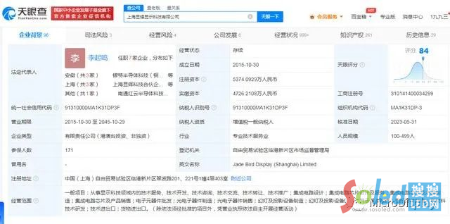 6月3日消息,據(jù)天眼查App顯示,近日,JBD關(guān)聯(lián)公司上海顯耀顯示科技有限公司發(fā)生工商變更,股東新增浙江阿里巴巴云計(jì)算有限公司等,同時(shí)公司注冊(cè)資本從約5197萬(wàn)人民幣增至約5374萬(wàn)人民幣。