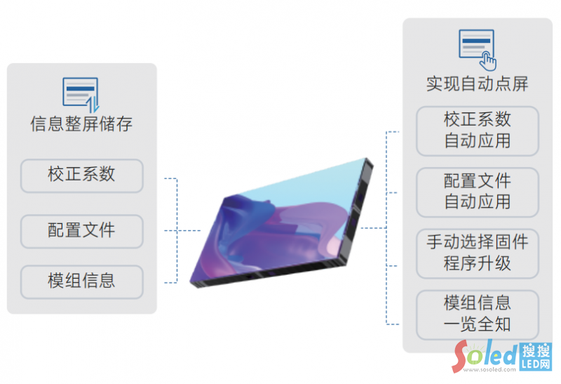 芯片內(nèi)嵌監(jiān)控模塊,支持模組級(jí)通信誤碼率、溫度/電壓、燈珠狀態(tài)監(jiān)測(cè),實(shí)現(xiàn)問(wèn)題的快速、精準(zhǔn)定位和維護(hù)。校正系數(shù)、配置文件、模組信息一芯儲(chǔ)存,提升了顯示屏生產(chǎn)及維護(hù)效率,降低了售后成本。