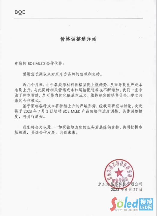 與利亞德同日發(fā)布漲價(jià)通知的還有京東方晶芯,6月27日,京東方晶芯發(fā)布《價(jià)格調(diào)整通知函》,其稱,近幾個(gè)月來,由于各類原材料價(jià)格呈現(xiàn)上漲趨勢(shì),從而導(dǎo)致生產(chǎn)成本急劇上升,與此同時(shí)相關(guān)營(yíng)運(yùn)成本如運(yùn)輸配送等也不斷增加。京東方晶芯一直專注于降本增效,盡可能內(nèi)部化解成本壓力,維持穩(wěn)定的銷售價(jià)格,建立共贏的合作模式。鑒于面臨各種成本將持續(xù)上升的嚴(yán)峻形勢(shì),經(jīng)研究與討論,決定將7月1日起對(duì)BOE MLED產(chǎn)品價(jià)格作適度調(diào)整。具體調(diào)整幅度,將另行通知。