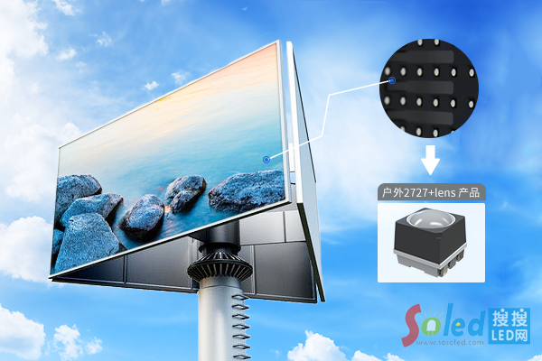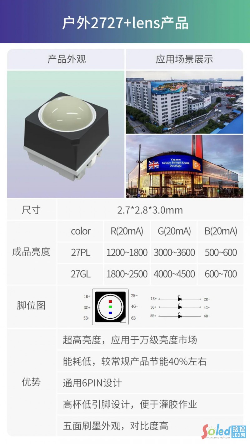 通過(guò)技術(shù)革新,2727+lens產(chǎn)品較原有2727產(chǎn)品亮度同比提升30%~50%以上,比如原有2727亮度6000nit,相同配置情況下2727+lens產(chǎn)品亮度提升至10000nit。2727+lens新品具有高亮度、低能耗、高可靠性、高性價(jià)比等顯著特點(diǎn),可適配商店標(biāo)牌、廣告牌、電視墻、交通指示屏、亮化市場(chǎng)等多種戶外顯示場(chǎng)景的應(yīng)用需求。