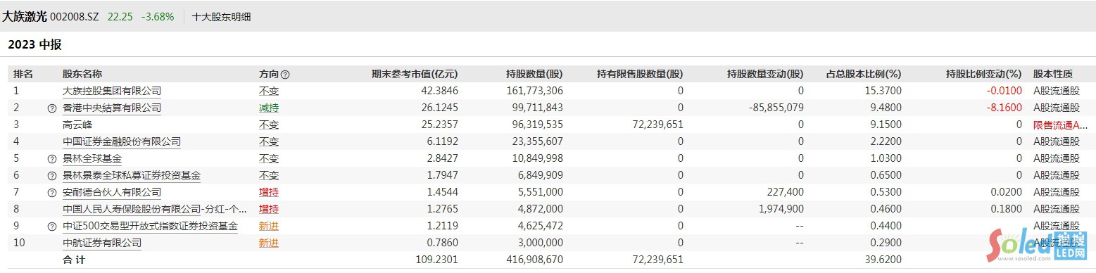 另外,大族激光披露的前十大股東最新持股情況顯示,香港中央結(jié)算有限公司持股比例較一季度末減少8.16%,讓出第一大股東位置;大族控股集團(tuán)有限公司重回第一大股東位置。