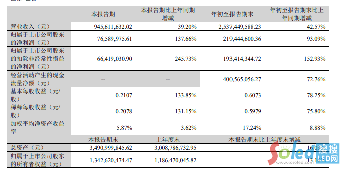 核心提示:10月17日晚間發(fā)布三季度業(yè)績公告稱,2023年前三季度營收約25.37億元,同比增加42.57%;歸屬于上市公司股東的凈利潤約2.19億元,同比增加93.09%;基本每股收益0.6073元,同比增加78.25%。