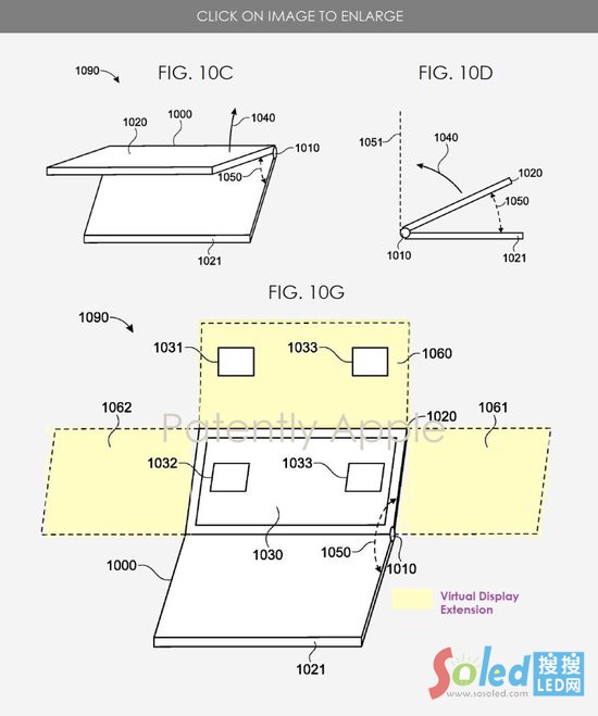在第二個(gè)例子中,蘋果公司的專利圖展示了類似 MacBook 的可折疊設(shè)備。在專利圖 10G 中,我們看到另一個(gè)調(diào)整大小操作的例子,它根據(jù)需要擴(kuò)展物理 MacBook 的高度和寬度。