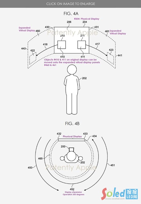 蘋果專利圖 4A 和 4B 示出了較大墻面尺寸顯示器或電視進(jìn)行調(diào)整大小操作的示例。圖 4A 示出了用戶 #202 和可穿戴電子設(shè)備(例如,HMD/Apple Vision Pro);圖 4B 示出了調(diào)整大小操作的俯視配置示例。圖 4B 示出了擴(kuò)展操作的彎曲顯示。例如,當(dāng)顯示器 #204 在方向 #450 上擴(kuò)展時(shí),擴(kuò)展的顯示器是彎曲的。