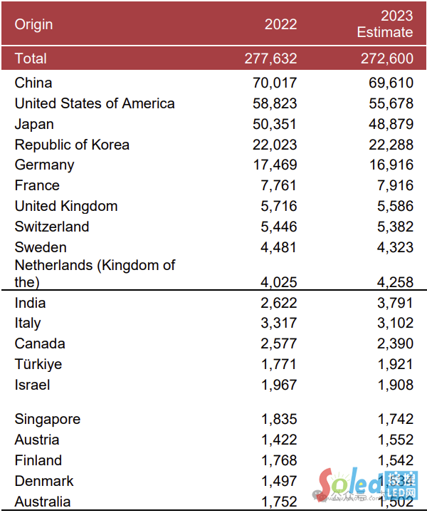 從各國申請量排名來看,2023年中國依然是全球最大的PCT專利申請國,共提交了69610件PCT專利申請,雖然同比下滑了0.6%,但仍大幅領(lǐng)先于排名第二位的美國的55678件(同比下滑5.3%)。日本(48879件,同比下降2.9%)、韓國(22288件,同比增長1.2%)、德國(16916件,同比下滑3.2%)分列第三至第五位。