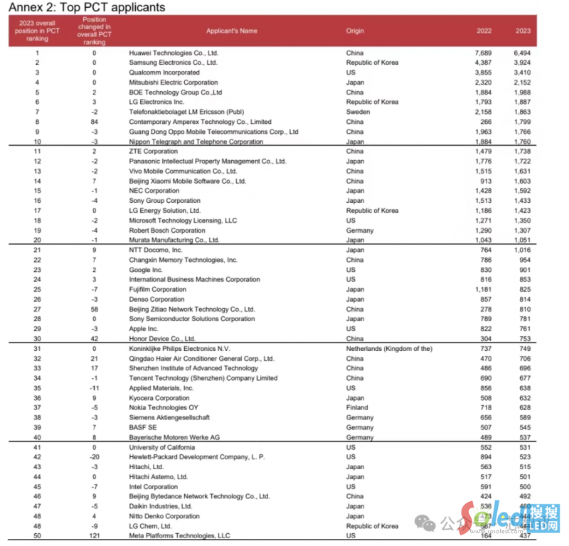 從申請人排名來看,華為2023年申請了6494件PCT專利排名第一,三星(3924件)、高通(3410件)、三菱電機(2152件)、京東方(1988件)分別位列第二至第五名。