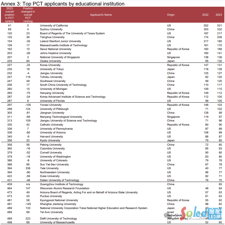 從各大教育機構(gòu)的PCT專利申請量排名來看,美國的加利福尼亞大學(xué)仍然是最大的申請人,2023年P(guān)CT專利申請量達(dá)531件。中國的蘇州大學(xué)位居第二(332份申請,總排名第69位),緊隨其后的是美國得克薩斯大學(xué)系統(tǒng)(217件)、清華大學(xué)(209件)和美國斯坦福大學(xué)(180件)。其中,清華大學(xué)是前五大教育機構(gòu)中增長最快的,同比新增了35件PCT專利申請。