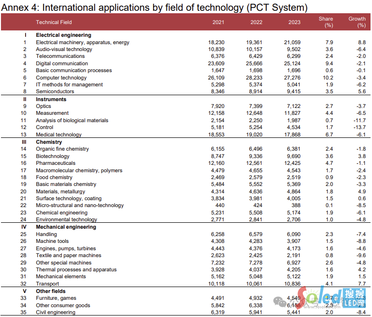 從增幅來看,在排名前十的技術(shù)領(lǐng)域中,只有四個領(lǐng)域在2023年實現(xiàn)了增長,其中電機(8.8%)的增長速度最快,緊隨其后的是運輸(7.7%)、半導(dǎo)體(5.6%)和生物技術(shù)(3.8%)。經(jīng)過連續(xù)七年的同比增長,計算機技術(shù)領(lǐng)域的PCT專利申請量在2023年下降了3.4%。同樣,數(shù)字通信領(lǐng)域的PCT專利申請量也在2023年也下降了2.1%,這是自2019年以來的首次下降。