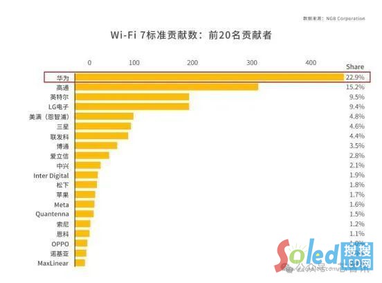 在Wi-Fi 7專利方面,NGB報告顯示,華為Wi-Fi 7標(biāo)準(zhǔn)專利貢獻(xiàn)全球第一,總貢獻(xiàn)482項,占比22.9%,位居全球第一。排名第二的高通占比15.2%,排名第三的英特爾占比9.5%。