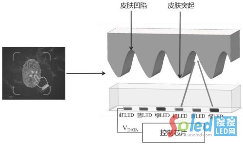 該專利發(fā)明提供一種基于Micro LED屏幕的指紋識(shí)別裝置,當(dāng)需要指紋識(shí)別功能時(shí),觸摸感應(yīng)模塊確認(rèn)手指的按壓位置,手指下方的第一LED芯片用作指紋識(shí)別的光源,與第二LED芯片連接的像素驅(qū)動(dòng)電路測量第一LED芯片發(fā)射的光線經(jīng)過指紋凸起和凹陷處的反射光在第二LED芯片上產(chǎn)生的光電流的電壓差,確定指紋的形狀;指紋識(shí)別功能完成,Micro LED屏幕恢復(fù)正常顯示狀態(tài)。