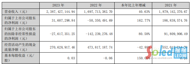 在財(cái)務(wù)數(shù)據(jù)方面,2023年乾照光電實(shí)現(xiàn)營收23.87億,同比增長40.63%; 同期歸母凈利潤0.32億元,實(shí)現(xiàn)扭虧轉(zhuǎn)盈;扣非后歸母凈利潤虧損0.28億元,同比縮窄80.58%。 拆分成單季來看,乾照光電2023年上半年凈利潤還處于虧損狀態(tài),轉(zhuǎn)機(jī)出現(xiàn)在第三季度,第四季度。 數(shù)據(jù)顯示,Q1至Q3公司實(shí)現(xiàn)歸母凈利潤分別為-1.02億元、-0.06億元、0.21億元;Q4歸母凈利潤為1.19億元,同比增長510.34%,環(huán)比增長466.67%。 分產(chǎn)品來看,2023年乾照光電主營業(yè)務(wù)中,外延片及芯片收入17.47億元,同比增長20.27%,占營業(yè)收入的73.17%; 境內(nèi)營收23.63億元,占整體營收的98.97%。 針對(duì)業(yè)績表現(xiàn)乾照光電表示:2023 年,RGB 顯示終端需求呈現(xiàn)增長恢復(fù)趨勢(shì),但整體還是存在比較突出的供過于求問題,但乾照光電正加大 Mini LED、背光、植物照明、車載 LED、太陽能電池、VCSEL 等高附加值產(chǎn)品的拓展力度,中、高端產(chǎn)品收入占比不斷提升。