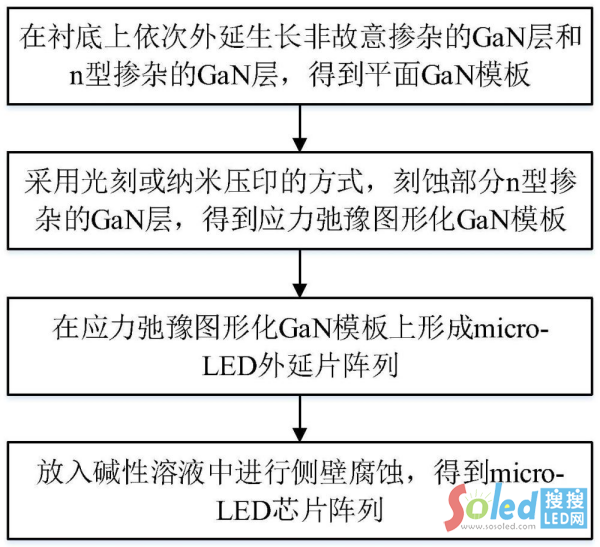 專利摘要顯示,本發(fā)明公開(kāi)了一種基于無(wú)掩模二次外延的Micro LED芯片陣列的制備方法。本發(fā)明通過(guò)對(duì)GaN模板進(jìn)行干法刻蝕,形成應(yīng)力弛豫圖形化GaN模板,再在應(yīng)力弛豫圖形化GaN模板基礎(chǔ)上選區(qū)二次外延多量子阱等結(jié)構(gòu),有效避免對(duì)多量子阱區(qū)域進(jìn)行干法刻蝕,從而避免了多量子阱的側(cè)壁刻蝕損傷;應(yīng)力弛豫圖形化GaN模板使得n型摻雜的GaN受到的應(yīng)力得到有效弛豫;在應(yīng)力弛豫圖形化GaN模板上生長(zhǎng)的預(yù)應(yīng)力層,所受到的壓應(yīng)力得到部分弛豫,面內(nèi)晶格常數(shù)得到擴(kuò)張,從而減小銦并入所需要的能量,增加多量子阱中銦的并入;在制備應(yīng)力弛豫圖形化GaN模板中的刻蝕,使得只有GaN微米柱陣列的頂面為c面,作為生長(zhǎng)面;選區(qū)二次外延生長(zhǎng),不需要額外的掩模,降低了Micro LED制備工藝的復(fù)雜度。