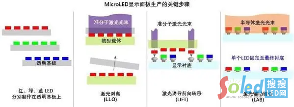 1) 紅、綠、藍(lán)三色 LED 分別制作在透明基板生長晶圓上。2) LLO:生長晶圓上的 LED 與帶有粘合劑的臨時載板接觸并固定,準(zhǔn)分子激光透過透明基板聚焦并將 LED 與其分離。3) LIFT:準(zhǔn)分子激光透過臨時載板聚焦,選擇性分離各個單顆 LED,并將它們轉(zhuǎn)移到最終基板上的焊盤位置。4) LAB:半導(dǎo)體激光一次加熱多顆 LED 和焊料,使其快速熔化并形成最終鍵合。