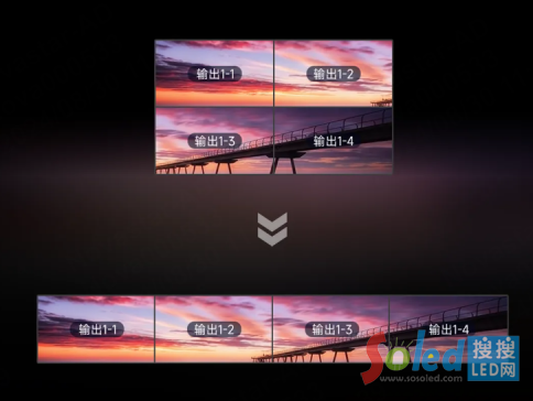 輸出口拆分重組,輕松解決接口超長分辨率輸出問題,最大可拆分為1024區(qū)域,讓長條屏顯示更加靈活自由。