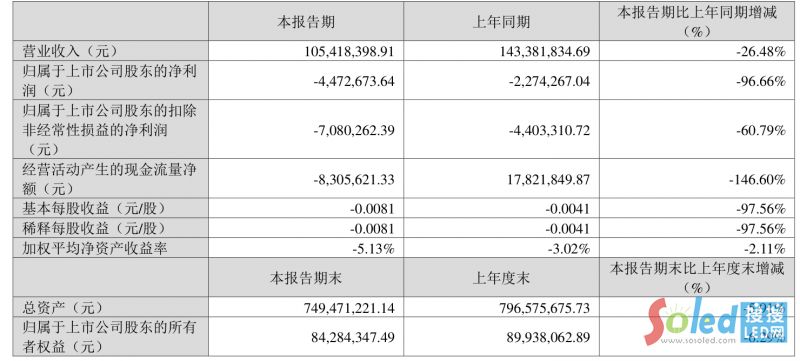 聯(lián)建光電(300269)4月26日披露2025年第一季度報(bào)告。公司實(shí)現(xiàn)營業(yè)總收入1.05億元,同比下降26.48%;歸母凈利潤虧損447.27萬元,上年同期虧損227.43萬元;扣非凈利潤虧損708.03萬元,上年同期虧損440.33萬元;經(jīng)營活動產(chǎn)生的現(xiàn)金流量凈額為-830.56萬元,上年同期為1782.18萬元;報(bào)告期內(nèi),聯(lián)建光電基本每股收益為-0.0081元,加權(quán)平均凈資產(chǎn)收益率為-5.13%。