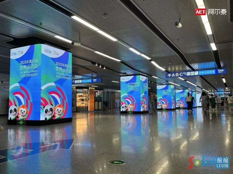 以光為炬,共襄盛會!當(dāng)賽事激情席卷蓉城,由AET阿爾泰打造的成都地鐵850㎡裸眼3D光顯矩陣——覆蓋14條地鐵線路、19個核心站點的44根LED包柱,瞬間變身賽事捷報傳播新陣地和國際化城市形象新載體,向世界展開一幅融合成都魅力與體育精神的未來畫卷。