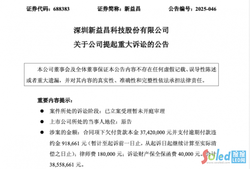 2025 年 9 月 23 日晚間,國(guó)內(nèi) LED 裝備領(lǐng)域龍頭企業(yè)新益昌(證券代碼:688383)發(fā)布重大訴訟公告,因下游客戶 “中順系” 企業(yè)長(zhǎng)期拖欠貨款,公司已正式將中順半導(dǎo)體科技(攀枝花)有限公司(下稱 “中順攀枝花”)、其法人代表劉文軍,以及關(guān)聯(lián)企業(yè)浙江中順半導(dǎo)體有限公司(下稱 “浙江中順”)、深圳市中順半導(dǎo)體照明有限公司(下稱 “深圳中順”)訴至攀枝花市仁和區(qū)人民法院,截至公告發(fā)布日,該案已被法院立案受理,但尚未開(kāi)庭審理。