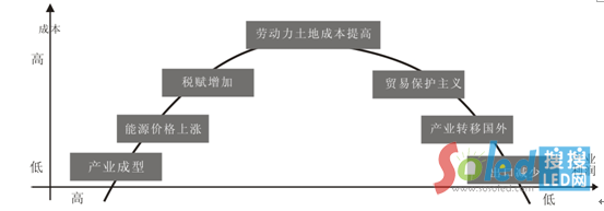 這是一組“哭泣曲線”圖,描述中國制造業(yè)當(dāng)前面臨的困境。在成為世界工廠之后,中國開始陷入貿(mào)易保護(hù)包圍圈,四面楚歌之下,曾經(jīng)的中國制造從微笑曲線變成了哭泣曲線。可以將中國現(xiàn)有的制造業(yè)困境定義為“哭泣曲線”,左邊是產(chǎn)業(yè)成型、能源價(jià)格上升和稅賦增加,中間是勞動(dòng)力、土地成本提高,右邊是貿(mào)易保護(hù)主義、產(chǎn)業(yè)轉(zhuǎn)移國外、出口減少。LED產(chǎn)業(yè)恰逢其時(shí),國內(nèi)產(chǎn)業(yè)即將成型,但是面臨勞動(dòng)力以及土地賦稅成本的制約,在國外又面臨“337”式的貿(mào)易保護(hù)主義威脅。從微笑到哭泣LED產(chǎn)業(yè)都在經(jīng)歷。